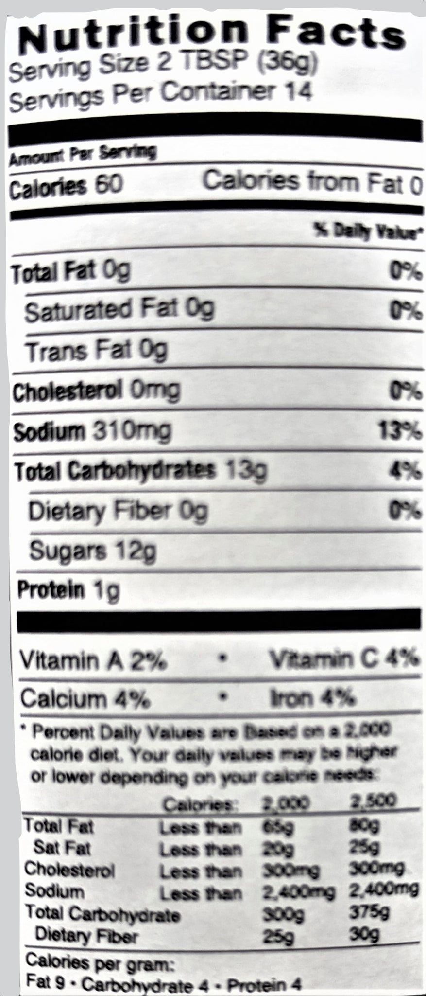 Tomato Paste, Brown Sugar, Molasses, Soy Sauce, Vinegar, Cane Sugar, Corn Syrup, Jalapeno Puree, Garlic Puree, Worcestershire Sauce, Dehydrated Onions, Salt, Onion Powder, Black Pepper, Chipotle Peppers, Natural Hickory Smoke, Cayenne Chili Pepper, Mustard Flower.